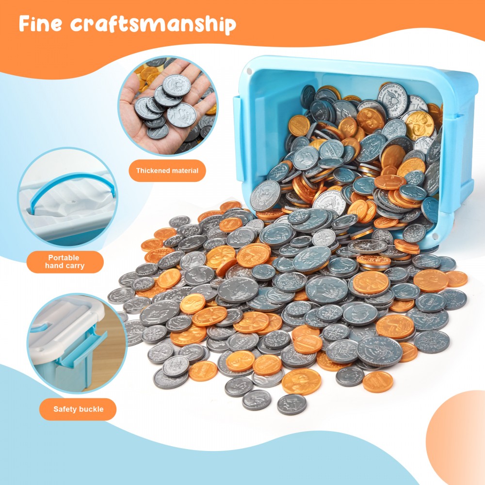 •   Realistic Fake Money for Imaginative Play – This coins set includes 6 types of US coins (1 to $1) with accurate sizes and details, perfect for pretend play toys, cash register for kids, or teaching money concepts.Each different coin is individually packaged in plastic bags and placed in a plastic box. Note -- that the 800PCS are packaged in integrated boxes, not separate boxes.