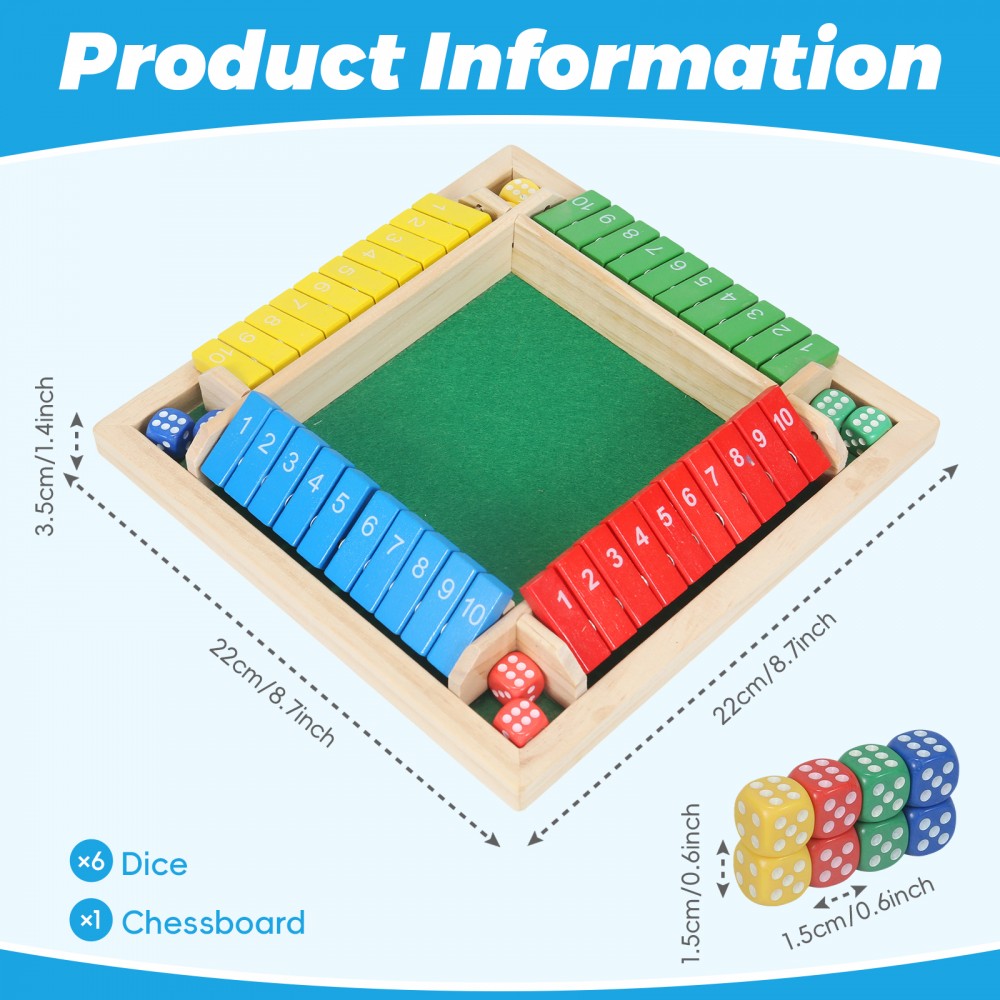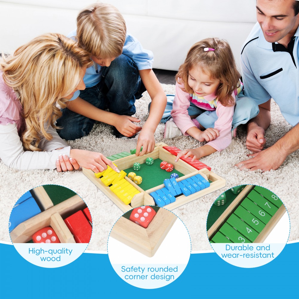 - PREMIUM QUALITY DESIGN-Shut the box made of solid pinewood. The design of felt surface reduces noise when the board game is going on. Durable, scratch-resistant and environmentally friendly. Four different colors of acrylic silk-screen technology dice to ensure long-term use.