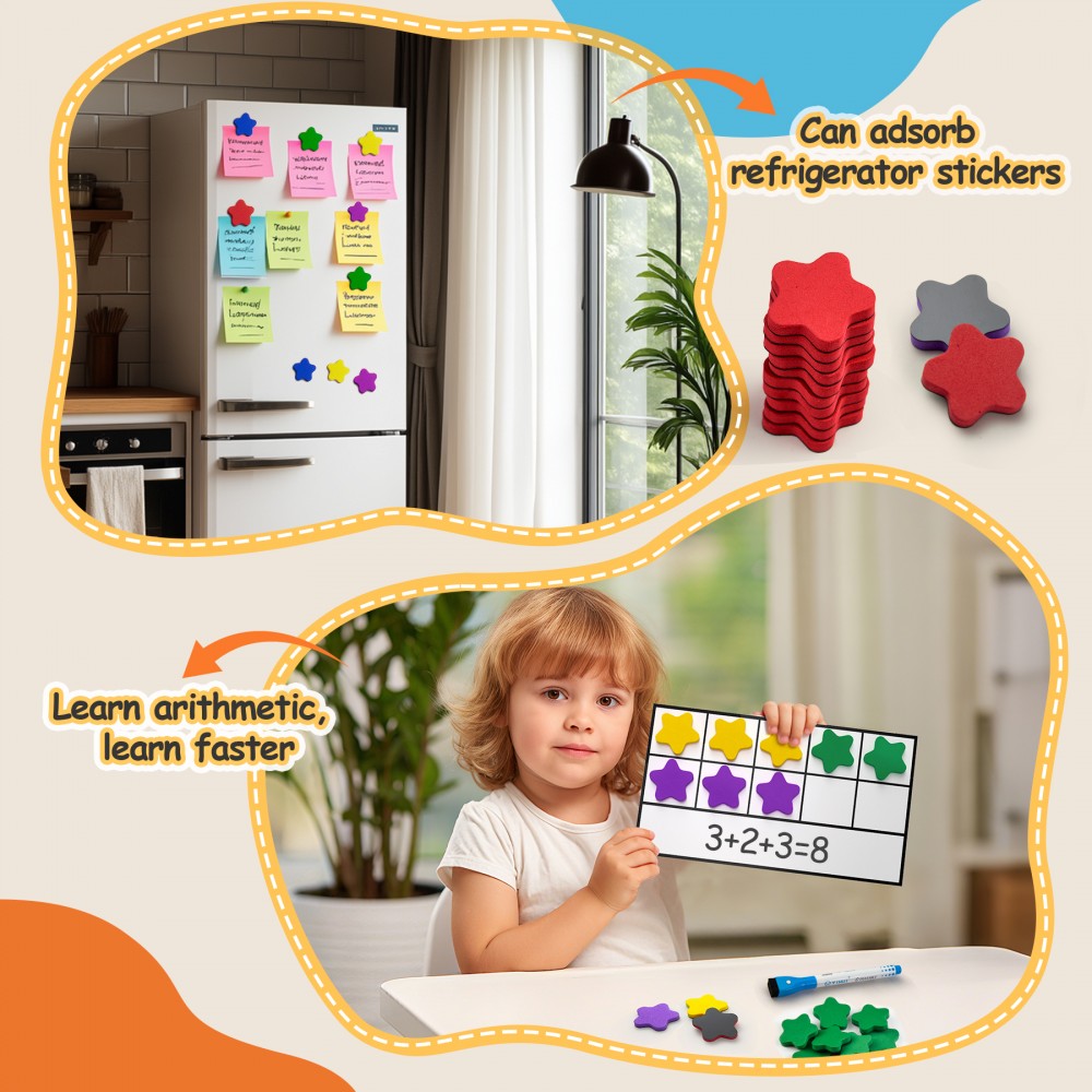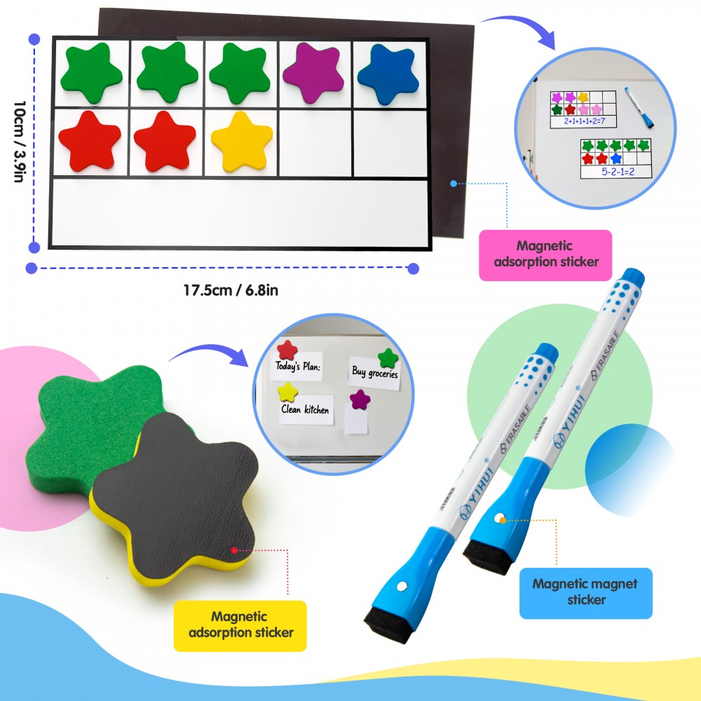 - Magnetic Ten-Frame Set: There are 6 different colors of Ten-Frame boards, and 10star-shape counters of each color(green, purple, red, yellow, blue, and orange; which is 60 counters in total) 4dry-erase markers with colored pigment, and a portable storage bag. There is an extra area for writing equations and numbers beneath the boards.